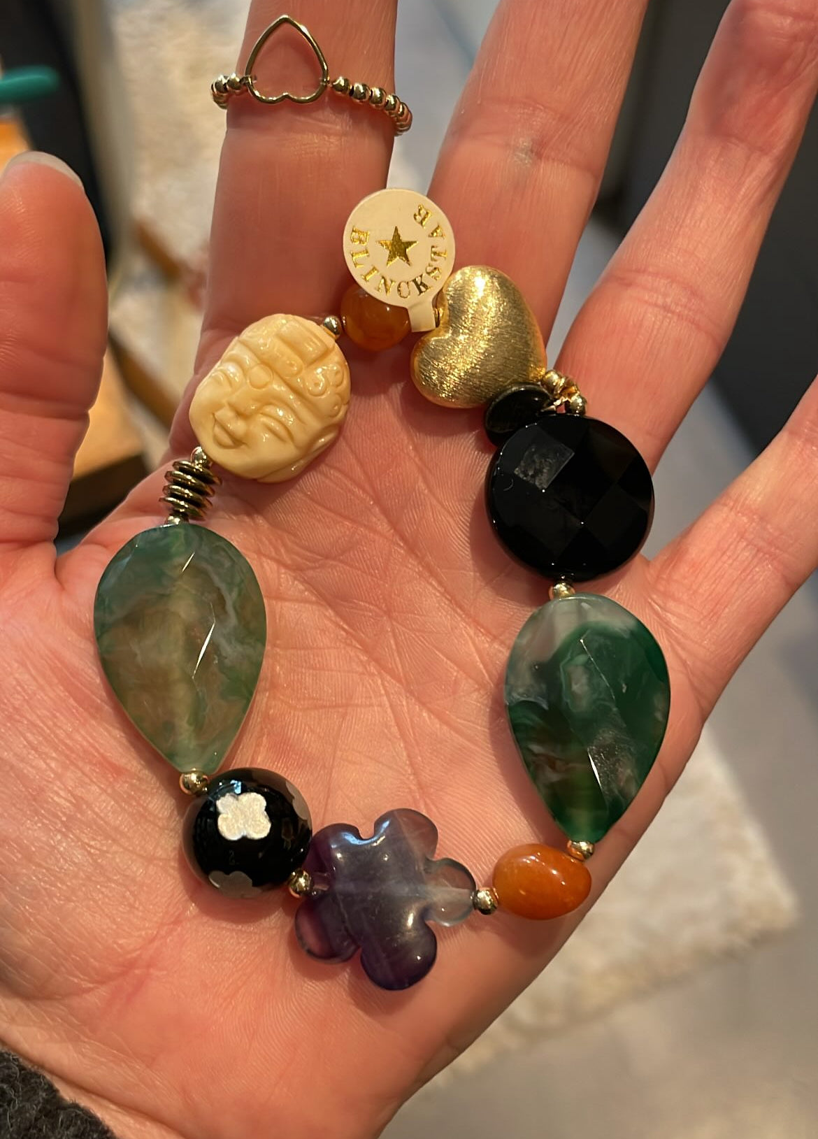 Prachtige armband geregen op elastiek met allemaal grote onderdelen, heel mooi puffy mat hart van echt zilver met een gouden laagje, grote zwarte Agaat kraal, een Fluoriet bloem, 2 grote druppels van Groene Aventurijn, twee nuggets van Rode Aventurijn, een budda gezichtje van Been en een zwarte agaat kraal met zilveren bloemetjes erin. Prachtig en er zijn er maar een paar! (Op de laatste foto zie je de kleuren in daglicht, dus een stuk donkerder)