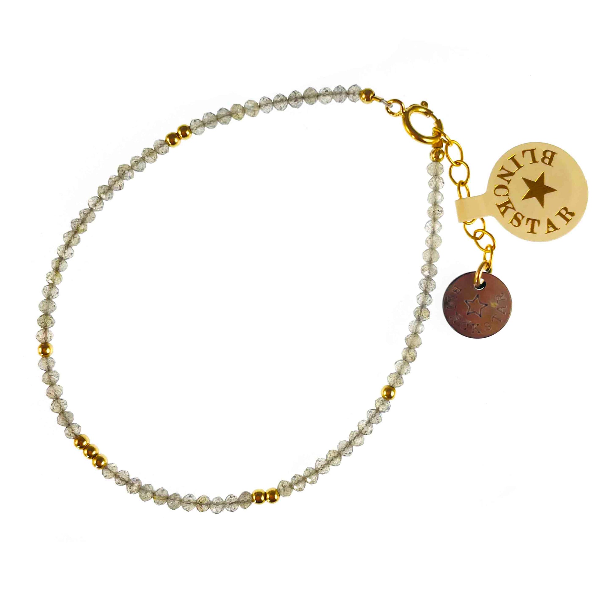 Te lieve armband geregen met Labradoriet steentjes, en mini Gold Filled kraaltjes. Er zit een stukje verleng ketting aan zodat iedereen haar past!