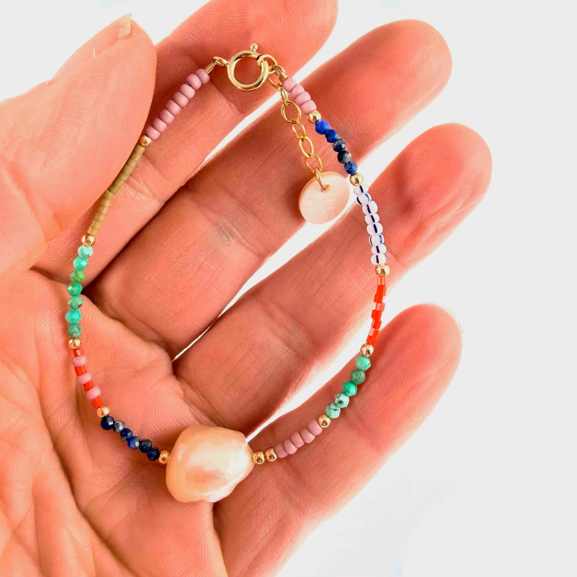 Super cute en vrolijk armbandje. Er zijn er maar een paar van gemaakt, vrolijke kleurtjes knallen je tegemoet, Turquoise en Lapis Lazuli, mooie roze Zoetwaterparel en allerlei mooie glaskraaltjes uit Japan en Tsjechië.. Met Gold Filled slotje zodat iedereen haar past.