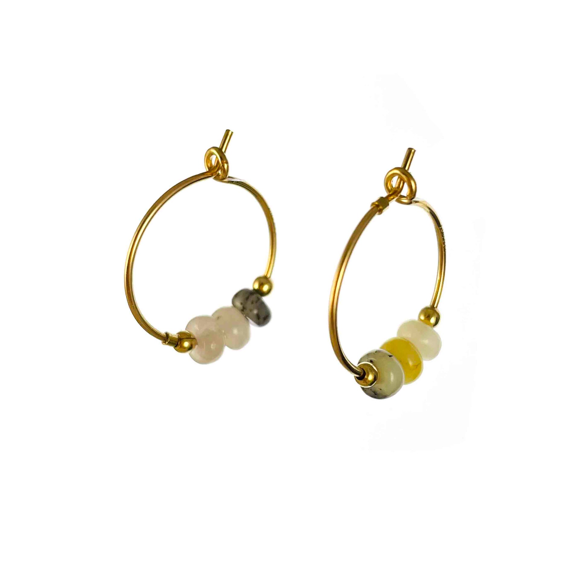 Super subtiele creooltjes van 15mm in doorsnede. Er zitten 3 schijfjes op geregen van Dentriagaat. Alle steentjes zijn net anders, maar wel in deze grijzige tinten.